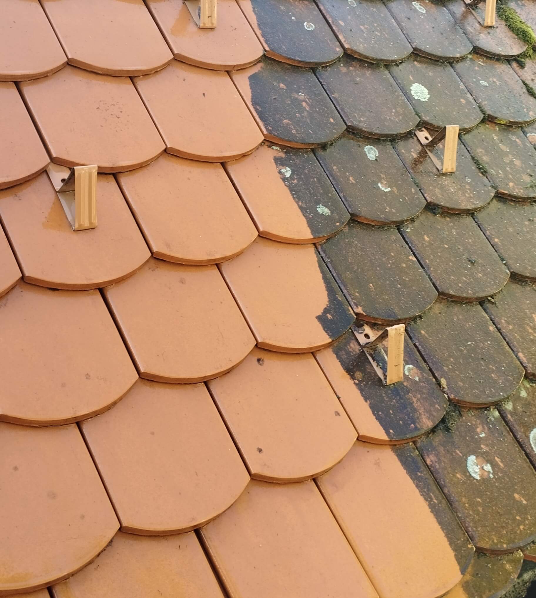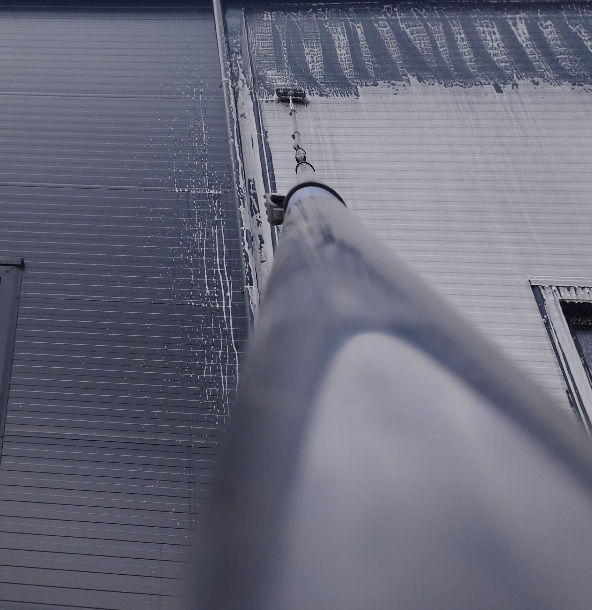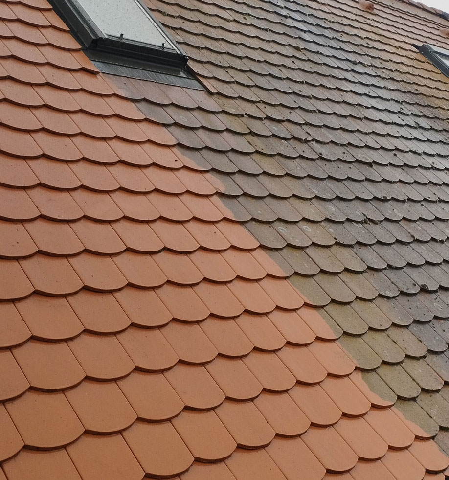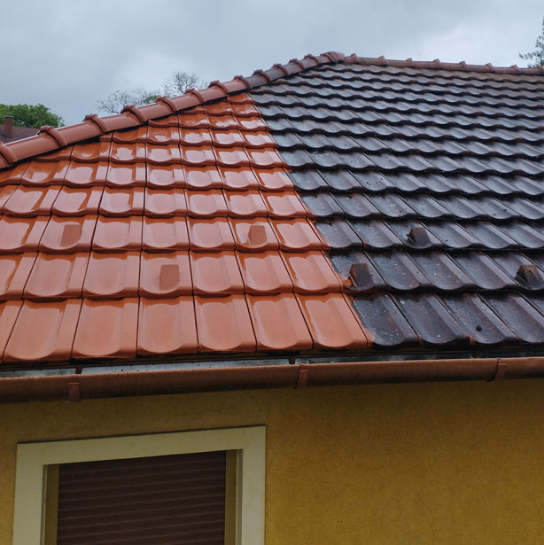 Mivel szerves szennyeződéssel van álltalában dolgunk,ezért egy tető tisztításra kifejlesztett vegyszer kerül habosítva felhordásra a felületre,majd egy karbon teleszkópos rúdra szerelt fuvókán keresztül magasnyomású vízzel történik a tisztítás!